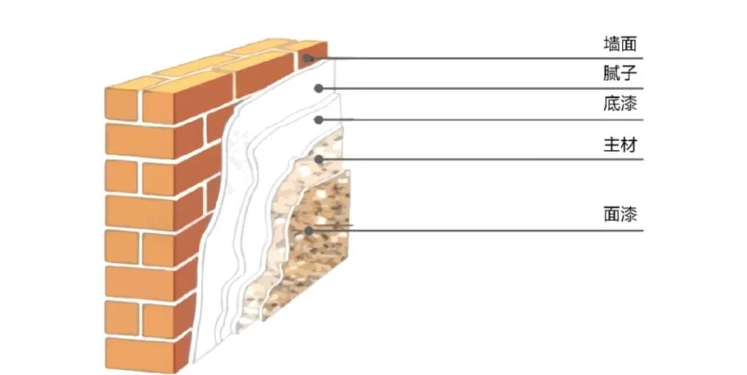 ①膩子(基面找平,抗裂)→②底漆(滲透性,抗堿性,封閉性)→③主材(裝飾性)→④面漆(自潔功能,耐水,耐臟)。